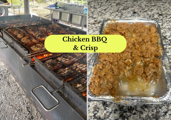 It’s time! It’s time! It’s time for some delicious BBQ chicken plus the featured dessert will be either apple crisp or cherry crisp. Yum. Yeah, this is how we kick-off the first BBQ of the season.