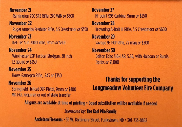 Get your tickets for the 2024 14th Annual Gun Raffle that’s 10 days long, raffling off 10 guns (one each day), and the ticket cost is just $10.00. Please stop by the station or see a member to get your tickets.